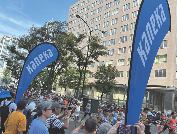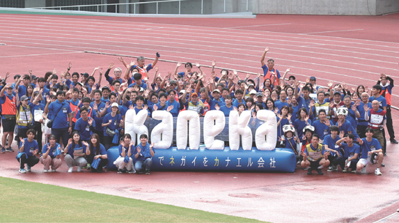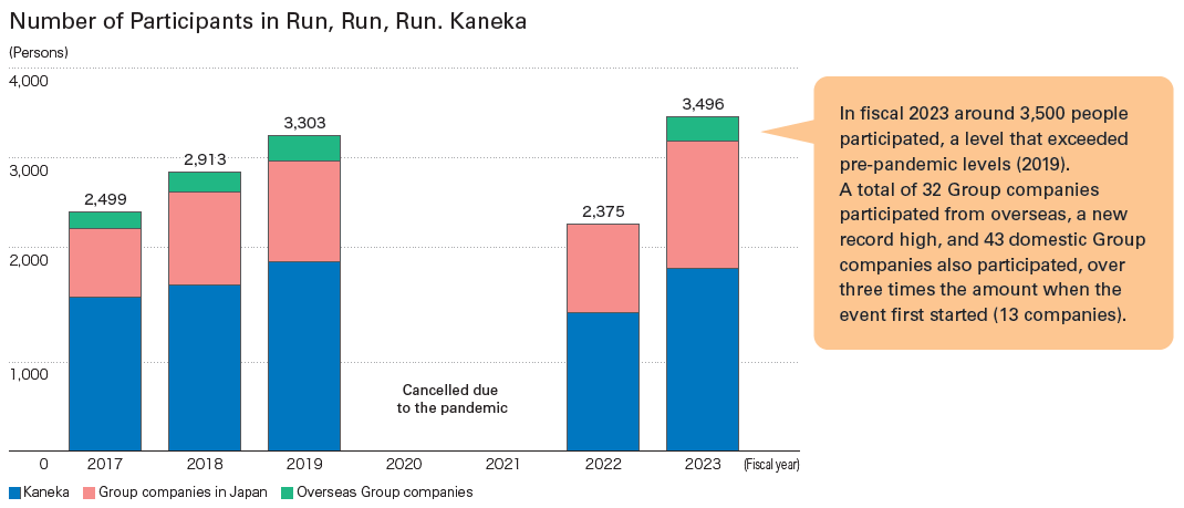 “Run, Run, Run. Kaneka.” is a sports event to deepen ties within the Kaneka Group started in fiscal 2014. It is major festival centering on running—the main event is a group Ekiden—where Kaneka Group employees from inside and outside Japan gather together in the same place.