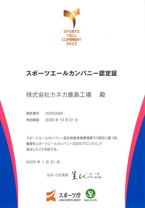 - 社員の健康増進のためにスポーツの実施など積極的な取り組みが認められ、「スポーツエールカンパニー」に認定。