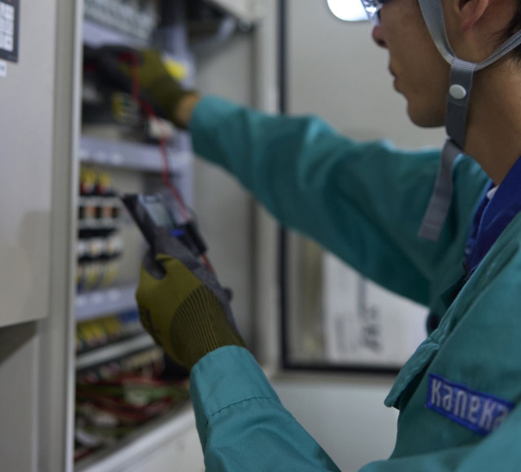 カネカのモノづくりは大きく2つの形態に分けられます。1つは、大きな反応器や乾燥機によって製品を製造する「装置型」の製造業務、もう1つは、押出機によって樹脂形態を変える「樹脂加工型」の製造業務です。いずれも安全最優先で、世の中に求められる製品を、より良く・より多く・より安く製造して提供することが使命です。仕事内容はオペレーション業務だけではなく、品質の向上やコストダウンなどの改善業務にも取り組み、高い生産性でモノづくりの最前線を支えます。