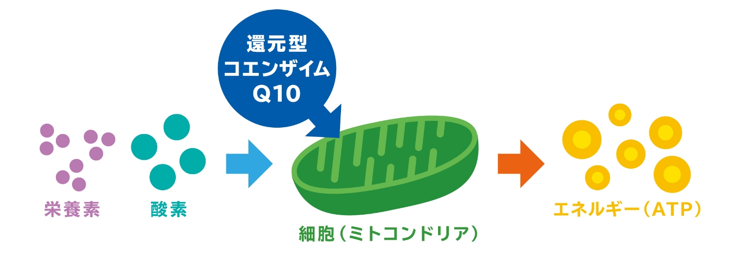 私たちのからだは約37兆個の細胞によって形づくられています。そして人が生きるために必要なエネルギーの大部分は、細胞の中のエネルギー工場(ミトコンドリア)で作られています。コエンザイムQ10は細胞内にある成分で、細胞のエネルギー産生をサポートする、なくてはならない成分です。ひとつひとつの小さな細胞が皆さまの毎日の“こころ”と“からだ”の元気を支えています。